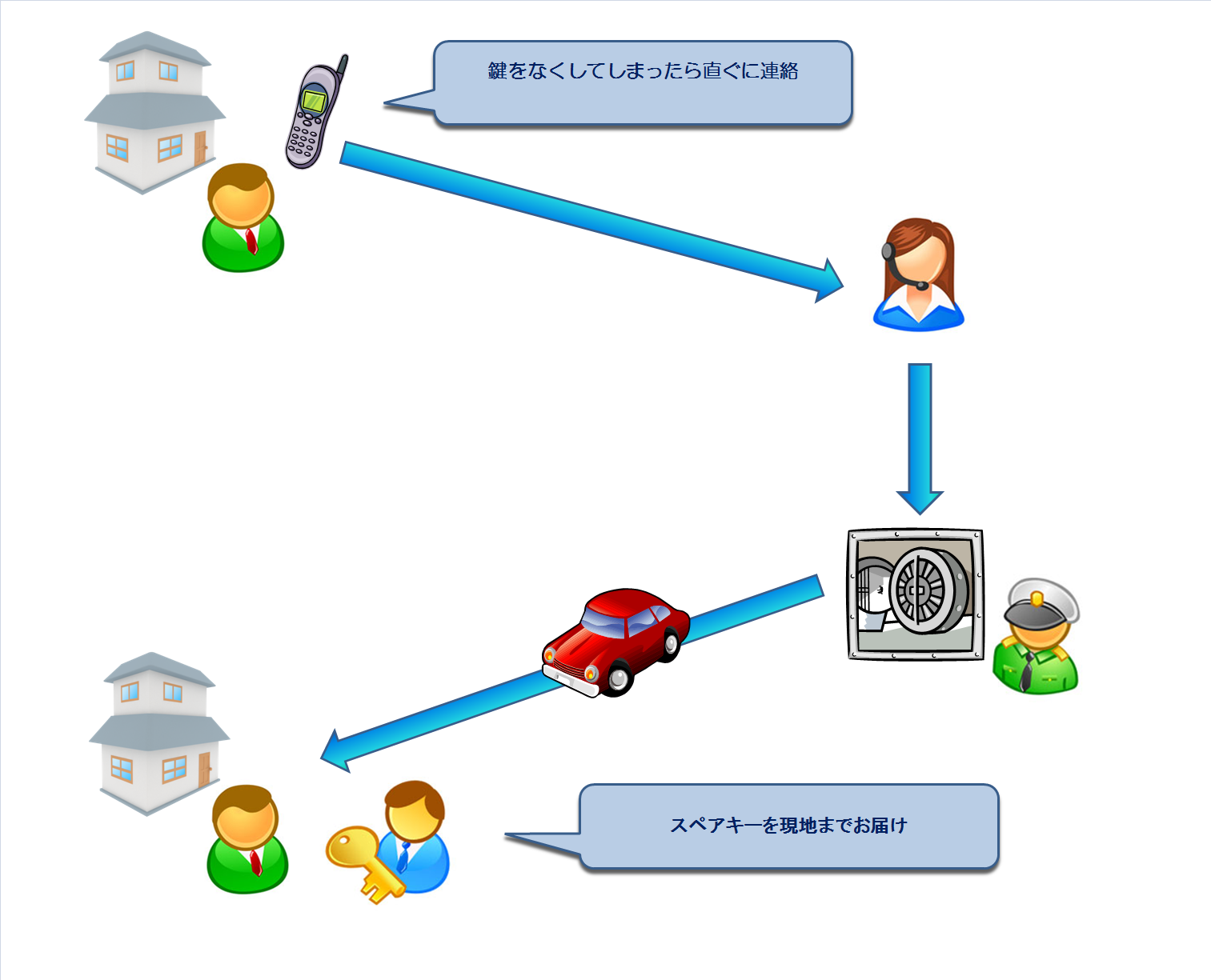 当サービスはお客様のスペアキーを保管しておき、鍵を紛失した場合にスペアキーを直接現地へとお届けするサービスとなっております。
